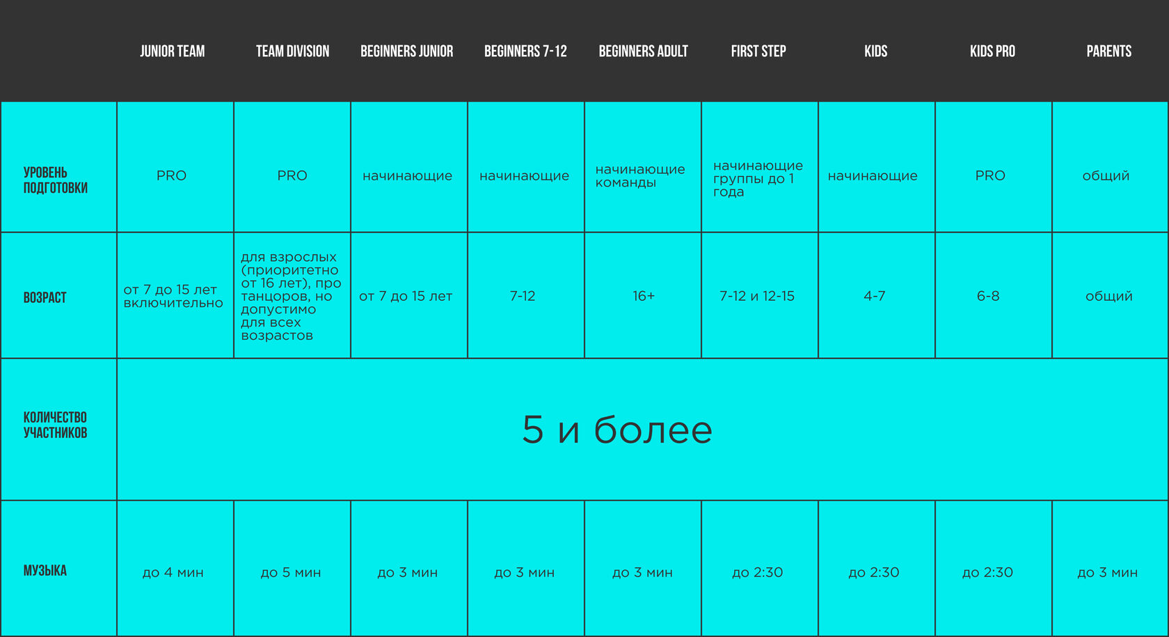 COMPETITION - командное соревнование для выявления наиболее талантливых, ярких танцевальных команд, которые смогут продемонстрировать владение разными стилями танцевальной культуры, выполнят свой номер синхронно, представят оригинальную идею, индивидуальный стиль и продемонстрируют креативность костюмов и музыки.